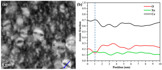 Irradiation-induced elemental segregation (RIS) at dislocation loops in the 4 MeV irradiated CeO2 pellets followed by 600 °C annealing for 3 h was examined using STEM-EDS (energy dispersive spectrometer) analysis. Figure 6 (a) presents a STEM dark-filed image of dislocation loops under the [−1 1 1] zone axis in irradiated CeO2 pellets sintered at 1000 °C. The dislocation loops exhibit a bimodal size distribution, with the diameters of the larger loops reaching up to 11.80 nm. To gain more insights into the dislocation loop, EDS line scans were employed to analyze elemental segregation, as shown in Figure 6b. The dislocation loop marked by the blue arrow in Figure 6a indicates that Ce and Xe tend to accumulate around the edge of the loop, while O is depleted in that region. As reported by Cao et al. [14], the dislocation loop in CeO2 is considered a strong sink for absorbing point defects and defect clusters induced by irradiation. The observed elemental segregation around the edge of the loop is attributed to the absorption activity of the dislocation loop. Meanwhile, Xe bubbles have accumulated along the grain boundaries, indicating that xenon segregation has also occurred in these regions. Modifications to the chemical composition and atomic structure of grain boundaries can lead to significant changes in a material’s corrosion resistance, radiation tolerance, and imperviousness to fission products [42]. Therefore, large-sized CeO2 pellet with lower-density grain boundaries exhibits more favorable resistance to corrosion and elemental segregation.