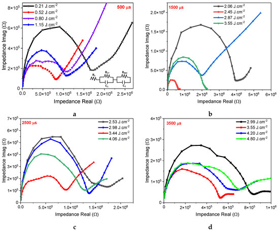 This section focuses on the variation of IS results for films treated with different energy densities and pulse durations of 500, 1500, 2500, and 3500 . For these measurements, the film is deposited onto FTO glass, and its electrochemical behavior can be represented by an equivalent circuit that produces a semicircle on the Nyquist diagram. Figure 3a–d displays IS results for samples treated using these different pulse durations and energy densities. When the pulse duration is fixed and the energy density is increased, the semicircle decreases until it reaches its minimum, and then the arc widens. The frequency response exhibits two distinct behaviors. At high frequencies (HF), it is dominated by the resistance attributed to electronic transport (). At low frequencies (), it is dominated by the recombination resistance () related to ionic diffusion and charge accumulation at the contacts [36,37]. In Figure 3, it corresponds to the second semicircle inclined at 45° to the real axis in the Nyquist graph [38]. The semi-circle in the high-frequency region is generally related to the counter-electrode and its interface [39]. A smaller half-circle suggests a lower and better photoconductivity of the device. These Nyquist plots suggest that our devices’ equivalent circuits can be accurately modeled by a resistor–capacitor (RC) pair in the dark AC regime [40]. As such, the interface contribution can be derived from the equivalent circuit’s parameters [41]. The series resistance (Rs) can be obtained by measuring the shift of the semi-circle from the origin along the horizontal axis [42]. However, the time constant related to the physical phenomena dominating at both the low and high frequencies is described by and , with [40]. The time constants can be deduced from the IS results by identifying the peak of the semicircle, which corresponds to the maximum frequency, or by calculating , as shown in Table 1.