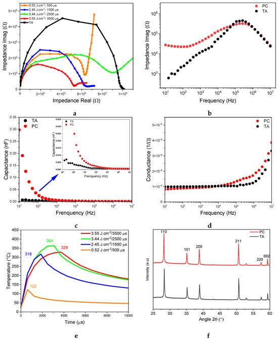 Figure 4a compares the Cole–Cole plots for films that are photonically treated using 500, 1500, 2500, and 3500 pulses with respective energy densities of 0.52, 2.45, 3.44, and 3.55 J.cm−2 with a typical film sample crystallized using standard thermal annealing.Clearly, the physical and chemical properties of the resulting films appear greatly affected by the pulse duration and energy density. When the pulse duration is 3500 and the energy density is 3.55 J.cm−2, the high-frequency arc is smallest, suggesting that the film is less resistive and facilitating charge transfer. In comparison, the thermally annealed sample exhibits a larger semicircle than all of the photonically treated samples. This suggests increased imaginary impedance associated with a decrease in charge transfer. Figure 4b–d compare the imaginary impedance, capacitance, and conductance versus the frequency for the best thermally annealed and the best photonically treated films for the conditions 3.55 J.cm−2 and 3500 . In Figure 4b, the high-frequency (HF) peaks appear between – Hz for both samples. The response time can be obtained by taking the inverse of the peak frequency from the imaginary impedance graph. Table 1 presents the IS parameters extracted from the spectra. There, the value for the thermally annealed sample is roughly twice the value achieved using optimal photonic curing conditions. This suggests that the /FTO interface provides a low under the effect of photonic annealing, which facilitates charge carrier transport. The resulting time constant is 0.8 for the thermally annealed film, compared to 0.38 for the optimal photonic curing conditions. This suggest that photonically induced crystallization promotes a faster response time, resulting in low recombination and more dominant ionic diffusion behavior [43,44]. At low frequencies, the thermally annealed device does not exhibit any measurable peak, which is consistent with the presence of the single semicircle in Figure 4b. In contrast, the impedance plot of the photonically treated device is curved at low frequencies, explaining the start of the second semicircle in this region. Frequency, time constant, and conductivity values are good indicators of process kinetics [45,46]. Indeed, the dark IS can be directly related to the carrier density, mobility, and conductivity [38]. The temperature simulation results using the photonic annealing parameters shown in Figure 4e reveal a relationship between the energy density, pulse duration, and resulting temperature of the film. As the energy density increases from 0.52 to 3.55 J.cm−2, the temperature increases from 122 to 364 °C then decreases to 329 °C for the film treated with an energy density of 3.55 J.cm−2 and a pulse duration of 3500 . These parameters are crucial to determine the energy transferred to the film, but they show a non-linear trend with temperature. Figure 4f shows X-ray diffraction (XRD) measurements of the thermally and photonically annealed films. The prominent peaks are determined to correspond to (110), (101), (200), (211), (220), and (002), confirming the tetragonal crystal structure of for both the TA and PC films [47,48,49].