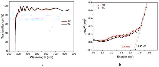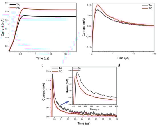 The optical properties of the prepared samples are characterized by UV–Vis absorption spectra. As shown in Figure 5a, the transmittance of PC-treated films is higher than that of TA-treated films, which is desirable for solar cell applications. is a direct bandgap (BG) semiconductor; its BG can be calculated using a Tauc plot [59], as shown in Figure 5b. The calculated BGs are 3.45 eV and 3.43 eV for the TA- and PC-treated films, respectively, which explains why the TA film is slightly more transparent than the PC film. Measurements in Figure 5c,d compare the dark injection transients for the photocurrent rise and decay for the thermally and photonically treated (3.55 J.cm−2, 3500 ) samples. This time-of-flight technique is useful for determining majority carrier mobility and trapping, especially in thin-films [60]. Figure 5c illustrates that the current for the photonically treated film rises to 2.7 , compared to 2.3 for the thermally annealed film. The current also increases more rapidly in the photonically treated sample, reflecting the interrelationship between charge carrier generation and recombination. Therefore, the rapid increase in current for the PC sample can be attributed to the fast accumulation of photogenerated carriers [61]. Figure 5d compares the decay of the transient current. After reaching its maximum, the current decay depends on the charge capture coefficient [62]. The decay graph illustrates the speed of charge recombination after being excited by a 1.2 pulse voltage. A shorter carrier lifetime suggests faster recombination and a high carrier capture rate, which implies more rapid current decay for the thermally annealed sample. In contrast, photonic curing yields a lower recombination rate, resulting in slower decay and longer current holding times. The photogeneration and recombination processes have a significant impact on the density and mobility of charge carriers. Figure 5e compares the charge mobility using the photo-CELIV technique using the following expression [63,64,65]: