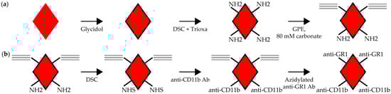 Chemicals and solvents were purchased from GFS Chemicals (Columbus, OH, USA) and Sigma-Aldrich (St. Louis, MO, USA). Anti-GR1, anti-CD11b, and human IgG were purchased from Southern Biotech (Birmingham, AL, USA). The polyethylene glycol (PEG) linker, azido-PEG12-NHS ester, was purchased from Broadpharm (San Diego, CA, USA). NHS-biotin was purchased from Quanta Biodesign (Powell, OH, USA), epichlorohydrin was purchased from Alfa Aesar (Haverhill, MA, USA), and N,N’-disuccinimidyl carbonate (DSC) was purchased from Novabiochem (now Sigma-Aldrich, St. Louis, MO, USA). Glycidol was a gift from Dixie Chemical Co. (Pasadena, TX, USA) and was redistilled under reduced pressure at 31 °C prior to use.