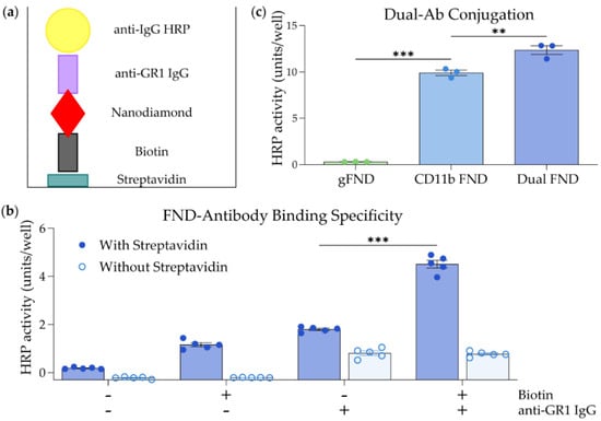 An ELISA-based assay was used to confirm the dual conjugation of antibodies to the FND surface. In the first assay, NHS-PEG12-biotin was conjugated instead of anti-CD11b antibodies to the aminated-propargyl FND. Successful conjugation of biotin to the FND results in anchoring of the FND to streptavidin-coated wells, while successful conjugation of anti-GR1 Ab allows for binding of anti-IgG goat anti-rat-HRP antibody (Figure 2a). The biotinylated anti-GR1 FND was diluted to 100 µg/mL, added to streptavidin-coated wells, and reacted for 2 h at room temperature. Controls included glycidol-coated FND, anti-GR1-only FND, and biotinylated-only FND. The enzymatic activity of goat anti-rat-HRP was used to detect the presence of the anti-GR1 Ab on the plated FND. The highest levels of HRP activity were generated for the FND, which displayed both anti-GR1 Ab and biotin (Figure 2b). The other constructs produced lower levels of activity that were similar to background levels seen when streptavidin was added to empty wells. To further confirm successful dual conjugation, goat anti-rat-HRP was used to detect the presence of antibodies after each conjugation step. Glycidol-coated FND (gFND), anti-CD11b-conjugated FND (CD11b FND), and dual conjugated anti-CD11b/anti-GR1 FND (Dual FND) were incubated with goat anti-rat-HRP for 2 h, and HRP enzymatic activity was measured. There was a significant increase in HRP activity following both CD11b conjugation (gFND vs. CD11b FND, p < 0.001) and GR1 conjugation (CD11b FND vs. Dual FND, p < 0.01) (Figure 2c). These results demonstrate the successful dual conjugation of anti-CD11b and anti-GR1 antibodies to the surface of FND.