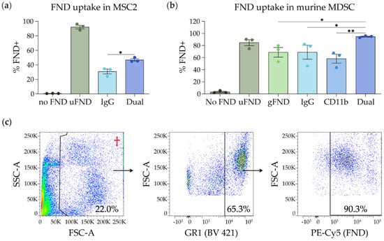 To quantify the uptake of FND by MDSC, FND were cultured with MSC2 cells and murine MDSC. MSC2 cells are an immortalized murine cell line of CD11b+/GR1+ immunosuppressive myeloid cells used to model MDSC [41,42,43]. MSC2 cells were cultured for 24 h with 25 µg of the following FND: uFND, IgG FND, or dual-Ab (CD11b/GR1) FND. The uptake of FND was evaluated via flow cytometry on the PE-Cyanin 5.1 channel at the 667 nm emission wavelength. The greatest uptake in MSC2 cells was seen with uFND at an average rate of 92.2%, compared to 30.8% with IgG FND and 46.8% with dual-Ab FND (Figure 3a). There was a significant increase in uptake of dual-Ab FND compared to IgG FND (p < 0.05). Purified splenic MDSC from three EMT6 tumor-bearing mice were cultured for 24 h with 25 µg of the following FND: uFND, gFND, IgG FND, CD11b FND, or dual-Ab (CD11b/GR1) FND. Following the 24 h incubation, FND uptake by GR1high MDSC was evaluated via flow cytometry. MDSC cultured with dual-Ab FND averaged the highest uptake at 96.2%. Uptake by uFND, gFND, IgG FND, and CD11b FND was 84.7%, 68.7%, 69.0%, and 58.3%, respectively. Dual-Ab FND uptake was significantly higher than gFND (p < 0.05), IgG FND (p < 0.05), and CD11b FND (p < 0.01) (Figure 3b). Representative flow cytometry gating is shown in Figure 3c.