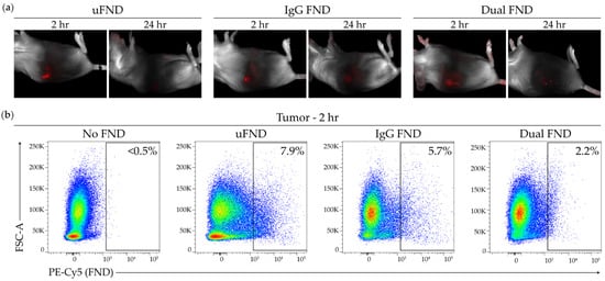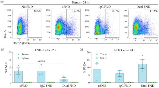 To visualize the localization of FND in vivo, mice were imaged using the Maestro spectral imaging software following intra-tumoral injection of FND. EMT6 tumors were subcutaneously implanted in the dorsal flank of 4–6-week-old BALB/c mice. Once tumors were approximately 1 cm in diameter, 100 µL of uFND, IgG FND, or dual-Ab FND at a concentration of 1 µg/µL was injected into the tumor, and FND localization was captured 2 and 24 h following injection. All three groups had a strong signal 2 h following injection (Figure 4a). At 24 h following injection, mice injected with IgG FND and dual-Ab FND had reduced fluorescence, while the mouse injected with uFND had no detectable fluorescence. To determine cellular uptake of FND following intra-tumoral injection, FND+ cells in the tumor and spleen were quantified via flow cytometry. Tumors and spleens were harvested from EMT6-bearing mice 2 and 24 h following intra-tumoral injection of either 100 µL buffer containing no FND or 100 µL of uFND, IgG FND, or dual-Ab FND at a concentration of 1 µg/µL. Tumors and spleens were processed into single-cell suspensions and analyzed via flow cytometry for FND uptake, as shown in Figure S4. At 2 h, 7.9% and 5.7% of all tumor and immune cells in representative tumors were FND+ following treatment with uFND and IgG FND, respectively. Approximately 2.2% of all tumor and immune cells were FND+ in a representative tumor treated with dual-Ab FND (uFND vs. dual-Ab FND, p = 0.183) (Figure 4b,d). FND positivity of all tumor and immune cells in the tumor increased slightly at 24 h (Figure 4c,e). Representative tumors injected with uFND, IgG FND, and dual-Ab FND had 12.3%, 8.0%, and 11.2% FND positivity in tumor/immune cells, respectively (Figure 4c). FND uptake in the spleen was undetectable (<0.5% FND+) at both 2 and 24 h in all three groups (Figure 4d,e and Figure S5). These results indicate that intra-tumorally injected FND localizes to the tumor and remains in the tumor for up to 24 h post-injection.