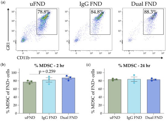 To evaluate the ability of dual-Ab FND to target MDSC in the tumor microenvironment preferentially, the percentage of CD11b+/GR1+ MDSC among all FND+ cells in the tumor was analyzed via flow cytometry. As described above, EMT6 tumors injected with uFND, IgG FND, or dual-Ab FND were harvested 2 and 24 h following injection, processed into single-cell suspension, and the percentage of MDSC among FND+ cells was analyzed by flow cytometry (Figure S6). All three types of FND demonstrated high specificity to MDSC, with the majority (75–90%) of FND+ cells in the tumor 2 and 24 h following injection being CD11b+/GR1+ MDSC (Figure 5b,c). At 2 h following injection, there was a trend toward an increase in the percentage of MDSC among FND+ cells in tumors treated with dual-Ab FND compared to uFND or IgG FND (uFND: 77.2% ± 2.4; IgG FND: 82.2% ± 5.5; dual-Ab FND: 87.1% ± 3.4; uFND vs. dual-Ab FND, p = 0.259) (Figure 5a,b). At 24 h following injection, all three types of FND had approximately 83% of their uptake by MDSC (Figure 5c and Figure S7). These results indicate that MDSC are the primary cell type that take up FND in the tumor and that dual-Ab conjugation could improve targeting specificity at 2 h following injection.