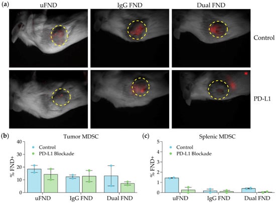 To evaluate the ability of FND to target MDSC in the setting of immunotherapy, FND were intra-tumorally injected into EMT6 tumor-bearing mice during the course of anti-PD-L1 therapy. Six EMT6 tumor-bearing BALB/c mice were treated with an anti-PD-L1 antibody, and six untreated mice served as controls. Twenty-four hours after the fourth dose, mice were given a 100 µL intra-tumoral injection of 1 µg/µL uFND, IgG FND, or dual-Ab FND. Animals were sacrificed 24 h after the FND injection and then imaged using the Maestro in vivo imaging system. In control mice, there was strong uptake in the tumor of dual-labeled FND and IgG-labeled FND as measured by fluorescence (Figure 6a). Administration of anti-PD-L1 therapy led to reduced uptake of the dual-labeled FND but not IgG-labeled FND (Figure 6a). Moreover, 24 h following intra-tumoral injection, FND tumors and spleens were harvested and processed into single-cell suspensions, and the percentage of FND+ MDSC was determined using flow cytometry (Figure S8). Approximately 10–20% of MDSC in the tumor were FND+ regardless of PD-L1 administration or type of FND injected. However, there was a trend toward reduced uptake of dual-Ab FND in mice treated with anti-PD-L1 compared to control (Figure 6b). Consistent with the results in Figure 4, there was low uptake of FND in spleens, with the highest percentage of splenic MDSC positive for FND being 1.5% from control mice treated with uFND (Figure 6c).
