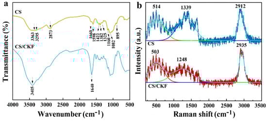 (a) FTIR spectra of CS and CS/CKF; (b) Raman spectra of CS and CS/CKF.