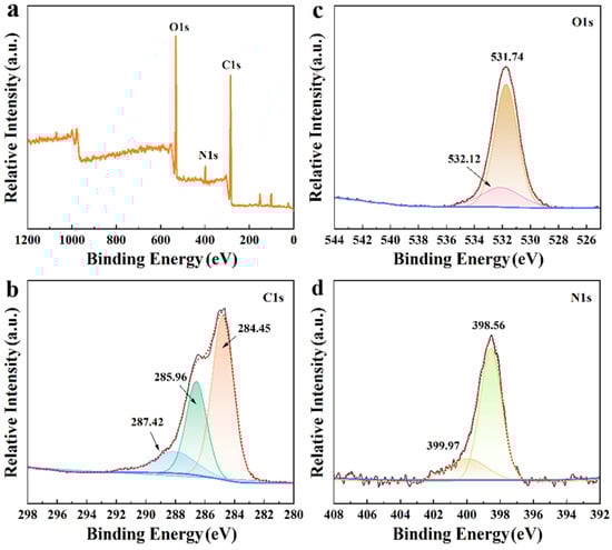 In order to explore the structure and chemical composition of CS/CKF, the XPS spectra of CS/CKF were analyzed. The signal peaks of O 1s, N 1s, and C 1s can be observed in Figure 2a, which represent the main elements in the CS/CKF composite material. The C 1s signal peak (Figure 2b) can be split into three peaks at binding energies of 287.42 eV (COO–H), 285.96 eV (C–OH), and 284.45 eV (C–C), respectively. This indicates that there are abundant C–OH groups and –COOH groups on the surface of CS/CKF [66,67]. The presence of these groups can also be proven by the O 1s spectral analysis. The O 1s peak can be split into two peaks at 531.12 eV (C=O) and 531.74 eV (–OH) (Figure 2c) [68,69]. In addition, the N-containing functional groups on CS/CKF were analyzed. The N 1s peak can be split into two peaks at 399.97 eV (–NH2) and 398.56 eV (C–N) (Figure 2d), indicating that amino groups are present on CS/CKF [70]. These results indicate that the CS does not chemically react with CKFs to form new chemical bonds, and CKFs and CS are held together by hydrogen bonding. Compared with the adsorption of Congo Red dye by CKFs or CS, it was seen that the adsorption effect of caragana fibers on Congo Red dye is not obvious, and chitosan plays a major role in the adsorption of Congo Red onto this material (Figure S8).