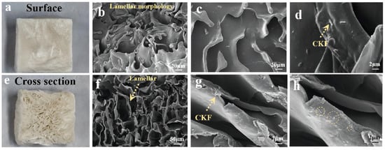 The surface morphology of the outer surface and cross-section of CS/CKF was observed (Figure 3). As shown in Figure 3a, the outer surface of the 3D-architecture material presents a cross-overlapping layered stacking structure, and there are a large number of pores between layers. As can be seen from Figure 3b, many CKFs are randomly distributed and attached to it. The CS polymer was combined with CKFs to form a layered structure, and these layers supported the structure of the CS/CKF 3D-architecture material. As shown in Figure 3c, the cross-section of CS/CKF exhibits many irregular porous structures, which are composed of pores stacked with lamellar structures on their surface. The hole wall thickness is about 5 μm (Figure 3d). Meanwhile, the SEM image of the cross-section shows that CKFs are not only attached to the surface of the lamel, but also partially embedded in the lamel. The length of the CKFs is about 2 μm, and they are randomly distributed between the pore wall and the lamel in short cylindrical rods. Since cellulose can form both intramolecular and intermolecular hydrogen bonds, intramolecular hydrogen bonds will limit the rotation of the glycoside bond, leading to a great increase in its rigidity. Therefore, the uniform distribution of CKFs in CS/CKF is beneficial to improve this composite’s mechanical properties. In the transversely stacked lamellar structure, CKFs provide a kind of longitudinal support, providing this composite with a strong ability to resist damage induced by external force during the compression process.