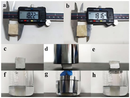 Height comparison photos of CS/CKF before (a) and after (b) 100 repetitions of compression; the photographs of CS/CKF in the air (c–e) and underwater (f–h) pressure tests.