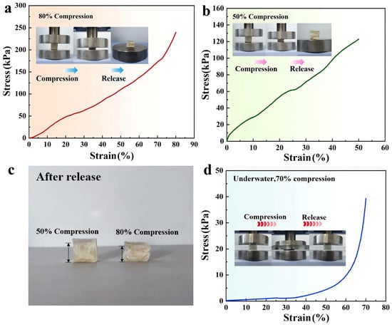 Compressive stress versus strain curves for the CS/CKF in air at 80% strain (a) and 50% strain (b); recovery of CS/CKF after release in the 50% and 80% strain tests (c); compressive stress versus strain curves for the CS/CKF underwater at 70% strain (d).