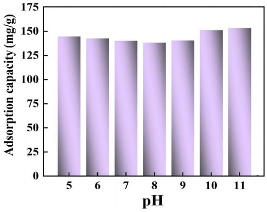 In this equation, C0 is the initial concentration of the CR solution (mg/L); Ce is the concentration of the CR solution at adsorption equilibrium (mg/L); V is the volume (L) of the CR solution used in the adsorption experiment; and m is the mass of the adsorbent (g). The influence of the initial pH on the adsorption performance was studied. The initial concentration of the CR solution was 200 mg/L, and the pH value of the CR solution was adjusted from 5 to 12 to evaluate the influence of the external pH value on adsorption.