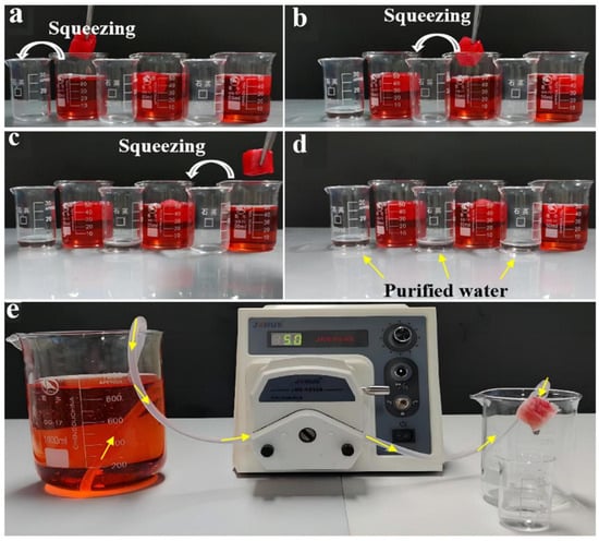 (a–d) Photographs illustrating the facile removal of CR using the CS/CKF; (e) photographs showing the CR separation process by in situ pumping in 5 mL/min.