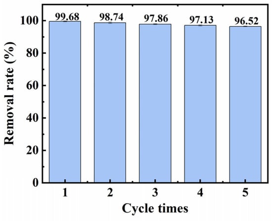 As an important parameter for adsorbents [71], the reusability of the composite material was studied through five CR adsorption–resolution cycles. The material was placed in 20 mL of CR solution with a concentration of 200 mg/L, oscillated in a oscillator, and the concentration of CR in the solution was determined after adsorption equilibrium was reached. Then, the material was removed from the CR solution by means of a filtration method, eluted with 0.1 mol/L NaOH and 250 mL of a C2H5OH solution, washed with deionized water, freeze-dried, and the experiment was repeated. Figure 8 shows the data collected during the experiment. After repeating the adsorption–resolution cycle five times, the adsorption material still successfully removed nearly 96.52% of the CR. These results show that the adsorption material has excellent performance in repeated use, and after many adsorption experiments, the adsorption of CR still demonstrated good performance.