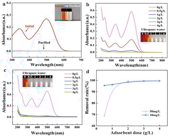 In practical applications, it is challenging to remove low-concentration pollutants in actual water bodies. Therefore, the removal efficiency of CS/CKF for low concentrations of CR dye (50 mg/L and 10 mg/L, respectively) was investigated at different dosages of adsorbents (0.5, 1, 2, 3, and 4 g/L, respectively). After adsorption, the UV–visible spectra of the CR solution were scanned and digital photos of the solution were taken to observe the change in color of the dye solution (Figure 9a,b). With the increase in the adsorbent dosage, the absorbance of the CR solution at the maximum absorption wavelength (497 nm) gradually decreased, and the solution gradually lost its color, indicating that the adsorption material is very effective in removing CR from water. When the dosage of the adsorbent material is 2 g/L, CR solution (concentration: 50 mg/L) becomes colorless after adsorption, with a removal rate of 99.48%. When the adsorbent dosage is 3 g/L, the removal rate reaches 99.65%, and when the dosage is increased to 4 g/L, the removal rate remains unchanged. The low-concentration CR solution (initial concentration: 10 mg/L) becomes colorless after adsorption with a 5 g/L dose of the adsorbent, with a high CR removal rate of 95.49%. When the adsorbent dosage is 4 g/L, the removal rate of CR dye reaches 99.56%. After adsorption, the absorbance of the solution at the maximum absorption wavelength in the UV–visible spectrum is close to zero. These results show that the CS/CKF material has strong capture ability for CR in water, even at low concentrations, making it promising for use in the thorough purification of dye wastewater.