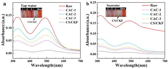 UV–visible spectra of a CR solution in tap water (a) and seawater (b) before and after adsorption with the CS/CKF material and three types of commercial activated carbon. The inset images are digital photos of the CR solution before and after adsorption.