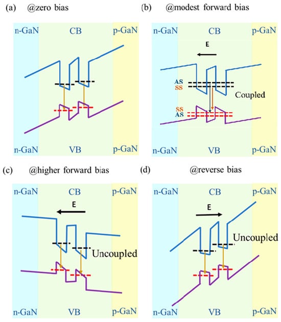 An important factor affecting the features of luminescence spectra is the electric field since it will affect the coupling of QWs. In fact, the Voc generated during PL measurements has a small variation range [23], smaller than the applied voltage in the EL test. Particularly, the applied voltage during EL measurements ranges from 3.2 V to ~7.4 V, which covers a large voltage range. Figure 1b,c show the influence of different voltages on the energy band of the active layer in EL. When a medium voltage is applied, the ground state energy level difference between the left and right wells decreases, and the coupling is strong. The energy level difference between the AS and SS is large, as shown in Figure 1b. When the applied voltage is further increased, the polarization of the well layer increases as well, while that of the barrier layer is lowered. This increases the difference between the ground state levels of the left and the right wells, which in turn decreases the coupling. As a result, the energy of the AS-AS level transition (Peak H) decreases while that of the SS-SS state increases (Peak L), for the AS and SS are both approaching the uncoupled state. At a higher voltage, the QWs may uncouple, as shown in Figure 1c. This is also consistent with the results shown in Figure 4b,d, where the energy of Peak H decreases with the increase in current density (increase in applied voltage), while that of Peak L increases within the range 10~30 A/cm2.