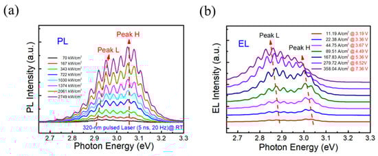 Figure 3 shows PL (a) and EL (b) spectra at different excitation powers at room temperature (RT), respectively. As is apparent from the plots, bimodal luminescence was observed in both PL and EL spectra. Assuming that the QWs are identical, the appearance of bimodal luminescence is associated with the adjacent wells’ coupling resonance. As a consequence, the ground state energy level of the QW splits from a single state into a symmetric and an antisymmetric one relative to the barrier center [13,14], thus leading to multi-level luminescence. In the following, we refer to the peak with higher energy as Peak H and the other one as Peak L. Peak H comes from the energy of the AS-AS level transition while Peak L comes from the SS-SS state (see Figure 1b). The optical behaviors observed in PL and EL spectra are clearly different. In order to further study the luminescence characteristics of CQWs in PL and EL, the peak energy and the corresponding FWHM were analyzed using Gaussian fitting, and the results are shown in Figure 4. The interference peaks are observed in the PL and EL spectra because of the interference effect between air/GaN and GaN/sapphire interfaces that formed a Fabry–Perot microcavity [17].