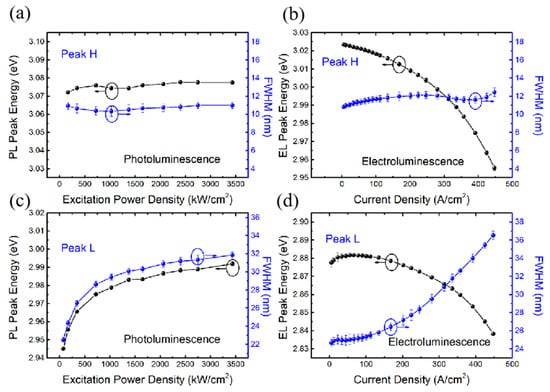 The peak energy and the corresponding FWHM of (a) PL and (b) EL of Peak H as functions of the excitation power and current density, respectively. The peak energy and FWHM of (c) PL and (d) EL of Peak L as functions of excitation power and current density, respectively.