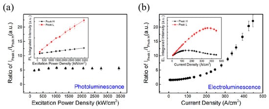 The integrated intensities of the two peaks were analyzed by Gaussian fitting. Figure 5a,b show the ratio between the integrated intensities of Peak L and Peak H in PL and EL as a function of the excitation power and current density, respectively. In PL, with the increase in excitation power density, the ratio of IPeak L/IPeak H remains almost constant at around ~5. In EL, the ratio increases with the injection current density, indicating that Peak L contributes a larger fraction of the whole luminescence spectrum. The inset shows the dependence of the integrated intensities on the excitation power and current density, respectively. In the inset of Figure 5a, it can be seen that Peak H and Peak L both increase linearly and there is no saturation, whereas in the inset of Figure 5b, we see that both the integrated intensities of Peak H and Peak L decrease at large current density. The decrease in Peak L is related to the thermal rollover phenomenon in LED, which is due to the thermal effect in EL. However, there is a decrease in the integrated intensities for Peak H at 100 A/cm2, which is mainly related to the modulation of the electric field into the QW. As the applied voltage increases, the QW coupling becomes weaker and weaker, so the integrated intensity of Peak H first linearly increases and then gradually decreases. On the other hand, the spectrum of Peak L is mostly affected by the localized states, so the weight of Peak L in the whole spectrum becomes stronger and stronger.