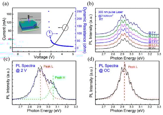 In order to assess the modulation effect of applied voltage, we perform further experimental measurements. Figure 6a shows the I–V curve and dynamic resistance characteristics of the LED. The inset displays the schematic diagram of the PL experimental setup modulated by the applied voltage. The turn-on voltage of this device is 2.8 V, so the applied voltage in the PL experiment is less than 2 V to make sure there is no electroluminescence in the spectra. A 355 nm pulsed laser is used as a source of lower excitation power density (2 kW/cm2) to obtain unimodal luminescence in the active region and the VOC value is ~1 V. We send the laser beam on the upper surface of the LED and keep it irradiated then connect the electrodes on n- and p-side to a Keithley 2400 source meter. We keep the laser power density constant and modulate the voltage applied to the LED. PL results together with the corresponding Gaussian fits are shown in Figure 6b–d for 2 V and open circuit (OC), respectively. As can be seen from the figures, for OC, the PL spectrum of LED shows unimodal luminescence. When a forward bias is applied to the LED, the PL spectrum gradually becomes bimodal, which is consistent with the analysis reported above. These results provide useful guidance for the design and fabrication of optoelectronic devices, especially devices with a resonant cavity. In microcavity optoelectronic devices, the coupling between a cavity mode and material gain plays an important role. The modulation effect of applied voltage on PL spectra means that the material gain will also shift with the applied voltage. The shift of the gain peak will degrade the coupling status and then the performance of the devices. Given that the good coupling between electrons and photons at resonant modes is desirable when designing and fabricating microcavity-based devices, the modulation effect of applied voltage is an important factor.