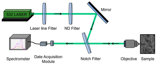 For Raman spectroscopy, a laser with a power output of 3 mW and a wavelength of 532 nm was employed. The Raman integration time, or exposure time, was set to 10 s. The configuration of the Raman setup is illustrated in Figure 2.