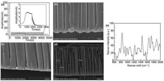 AAO: (a) voltage variation graph, (b) SEM cross-section without voltage reduction treatment, (c) SEM cross-section with voltage reduction treatment, (d) SEM cross-section of porous layer with the bottom barrier layer removed, and (e) Raman spectrum of 1 M artificial sweat measured on AAO.