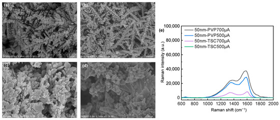 In this paper, PVP was utilized to electrodeposit nanostructures with distinct, slender main branches and branches, as depicted in Figure 4a,b. When the current was 500 μA, two distinct morphologies were observed. One exhibited slender main branches and branches, while the other displayed a seamless, feather-like sheet structure composed of closely packed AgNPs. At 700 μA, the structures predominantly showed slender main branches and secondary branches. The branches formed through TSC electrodeposition enveloped the main branches. At 500 μA, the branches exhibited an irregular flake morphology, whereas at 700 μA, an indiscernible dendritic structure of clustered AgNPs could be observed, as illustrated in Figure 4c,d.