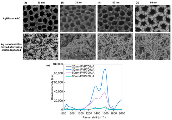 During the electrodeposition process, the use of different AgNP sizes influences the growth pathways of branches, thereby altering the morphology (Figure 5). AgNPs with sizes of 20 nm, 30 nm, 50 nm, and 60 nm were individually employed as electron transfer pathways to compare their differences, with a consistent current of 700 μA. The resulting morphologies are characterized by slender main branches and secondary branches with attached AgNPs. Figure 5a shows structures deposited on AAO with a size of approximately 20 nm AgNPs. When Ag nanodendrites are electrodeposited on AAO using 20 nm AgNPs as electron transmission pathways, the AgNPs attached to the branches appear in high-density clusters with a predominantly spherical shape. In Figure 5b, when 30 nm AgNPs are used as electron transmission pathways, the AgNPs are evenly distributed along the branches, tightly arranged but without overlapping. In Figure 5c, it is shown that when 50 nm AgNPs are used as electron transmission pathways, compared to the 30 nm ones, there is only slight variation in the AgNPs attached to the branches, but the overall morphology is more uniform and consistent. Figure 5d shows that in the case of 60 nm AgNPs, the branches tend to cluster together, forming bush-like structures. Spherical structures of regular size and shape are known to enhance LSPR more effectively than rod-shaped counterparts. Additionally, the optimal NP size for LSPR varies with the laser wavelength used. The Raman signal intensity of Ag nanodendrite SERS substrates, electrodepositing AgNPs of different sizes as electron transmission pathways and detected with 4 mM artificial sweat, was observed to assess the LSPR effect (Figure 5e). The results confirm that AgNPs with a regular spherical shape on the branches lead to a better LSPR effect. Notably, in addition to the 30 nm AgNPs, the 50 nm AgNPs also exhibit superior signal performance. However, at a reduced current of 500 μA, as shown in Figure 4a, these larger AgNPs tend to cluster, forming feather-like structures. Therefore, the current settings for electrodeposition with 30 nm and 50 nm AgNPs will be adjusted to optimize the substrate’s LSPR response. Furthermore, it is speculated that the signal from Ag nanodendrites electrodeposited with 30 nm and 50 nm as electron transmission pathways is significantly higher than the other two sizes. This is likely due to the more uniform and extensive distribution of nanosilver particles deposited on AAO, as shown in Figure 5a–d of AgNPs on AAO.