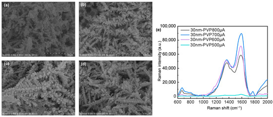The electrodeposition of Ag nanodendrites under different currents is conducted using 30 nm AgNPs as electron transmission pathways, with PVP serving as the protective agent: (a) 500 μA, (b) 600 μA, (c) 700 μA, (d) 800 μA, and (e) Raman spectrum of 4 mM artificial sweat measured on SERS substrates electrodeposited with different currents.