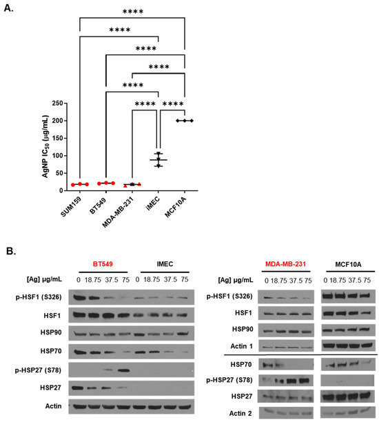 Figure 1. Low doses of AgNPs are more cytotoxic and modulate levels of heat shock proteins to a greater degree in TNBC cells than in immortalized mammary epithelial cells. (A) The cytotoxic IC50 values calculated from triplicate 10-point dose–response curves following 72 h exposure of each cell line to AgNPs are shown. Data points are in red for TNBC cell lines and in black for immortalized mammary epithelial cells. IC50 values for MCF10A cells were in excess of the dose range of AgNPs tested but were at least 200 µg/mL, as indicated in the figure. Statistical analysis was performed by one-way ANOVA followed by the post hoc Tukey test. Significant differences in IC50 values are indicated (**** p < 0.0001). (B) Heat shock protein expression was examined by Western blot 24 h after cells were exposed to AgNPs. Results are representative of duplicate independent experiments.