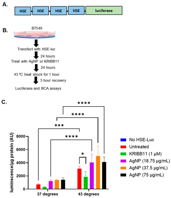 These studies indicated that AgNPs decreased the levels of multiple proteins involved in the HSR in TNBCs. In contrast, AgNPs had only modest effects on HSP expression in immortalized mammary epithelial cells. To determine if the effects of AgNPs on the heat shock response in TNBCs were caused at the transcriptional level, we transduced BT549 cells with a plasmid vector containing four copies of a heat shock response element (HSE), to which pHSF1 trimers bind and drive transcription of a luciferase reporter gene, indicative of a heat shock response (Figure 2A). Then, 24 h after transduction, cells were treated with AgNPs overnight, exposed to hyperthermic (43 °C) or physiologic temperature (37 °C) conditions, and luciferase activity was quantified 3 h later, as shown schematically in Figure 2B. The results of this experiment are shown in Figure 2C. AgNPs alone did not significantly increase HSE-driven luciferase activity at any of the doses tested. Exposure of cells to hyperthermia significantly increased luciferase activity, and this was reduced by co-treatment with KRIBB11, a selective inhibitor of HSF1, indicating that increased luciferase activity was dependent upon HSF1. Luciferase activity in AgNP-treated BT549 cells that were subsequently exposed to hyperthermia was similar to that of cells that were treated with hyperthermia alone. These data showed that AgNPs did not strongly induce a heat shock response in BT549 cells but also did not inhibit the capacity of cells to induce a heat shock response at a transcriptional level. Overall, our results suggest that AgNPs did not induce a protective HSR in TNBC cells. Decreased expression of HSPs in AgNP-treated cells is not due to transcriptional repression of the HSR and may be due to increased turnover or degradation of HSPs at the protein level.