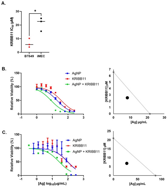 Figure 3. KRIBB11, an HSF1 inhibitor, synergistically increases the cytotoxicity of AgNPs in both TNBC and immortalized mammary epithelial cells. (A) The cytotoxic IC50 values calculated from triplicate 10-point dose–response curves following 72 h exposure of each cell line to KRIBB11 are shown. Statistical analysis was performed by Student’s t-test. A significant difference is shown (* p < 0.05). (B) BT549 or (C) iMEC cells were treated with AgNPs, KRIBB11, or AgNPs + KRIBB11 for 72 h and viability was assessed by the MTT assay, as shown. Isobolograms were plotted showing the expected additive effects of AgNPs and KRIBB11, and the dose of the combination that yielded Fa = 0.5 is plotted for each cell line. Results are representative of at least four biological replicates per treatment and two independent experiments per cell line.