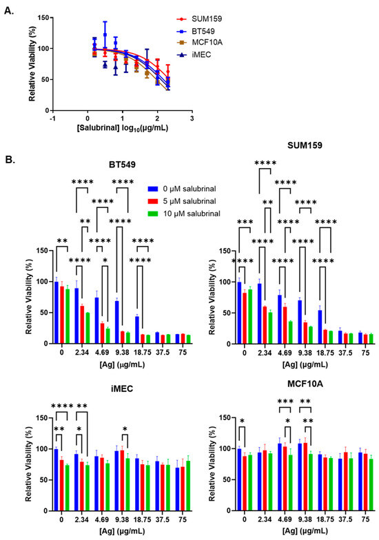 Figure 4. Salubrinal increases the cytotoxicity of AgNPs in TNBC but not in immortalized mammary epithelial cells. (A) Cells were treated with increasing doses of salubrinal for 72 h, and viability was assessed by the MTT assay. (B) Cells were treated with AgNPs with or without salubrinal for 72 h, and viability was assessed by the MTT assay. Results are representative of at least four biological replicates per condition and duplicate independent experiments. Statistical analysis was performed by two-way ANOVA followed by the post hoc Tukey test. Significant differences are indicated (**** p < 0.0001, *** p < 0.001, ** p < 0.01, and * p < 0.05).