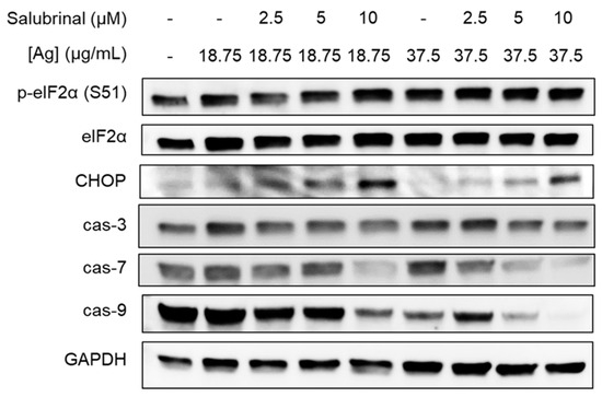 We investigated ISR and apoptosis signaling in BT549 cells treated with combinations of AgNPs and salubrinal for 24 h. We observed increased phosphorylation of eIF2α in BT549 cells exposed to the combination of AgNPs and salubrinal compared to the individual treatments (Figure 5). This is consistent with previous studies showing that salubrinal prevents dephosphorylation of eIF2α, resulting in increased peIF2α when cells are exposed to proteotoxic stressors [40]. Additionally, we found that the combination of salubrinal and AgNPs induced increased expression of downstream effectors of peIF2α-induced cell death, including pro-apoptosis protein CHOP and decreased expression of full-length caspase-3, caspase-7, and caspase-9, which is indicative of caspase cleavage.