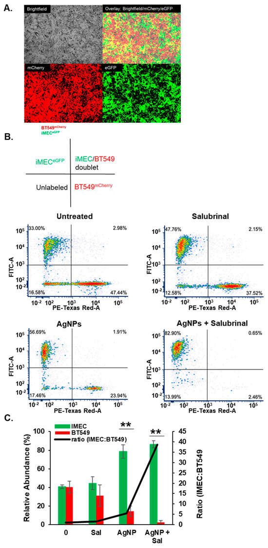 Figure 6. The combination of AgNPs and salubrinal selectively eliminates TNBC cells grown in co-culture with immortalized mammary epithelial cells. (A) BT549mCherry (red) and iMECeGFP cells (green) were grown in co-culture and imaged using fluorescent microscopy. Representative images from the individual visible, red, and green light channels, and an overlay of the three channels, are shown for untreated cells. (B) BT549mCherry and iMECeGFP cells grown in co-culture were treated with salubrinal alone (10 µM), AgNPs alone (37.5 µg/mL), or a combination of 10 µM salubrinal and 37.5 µg/mL for 8 days. Flow cytometry was used to quantify the relative fraction of each cell type remaining at the end of treatment. A schematic is shown to indicate the quadrants of the scattergrams below. The results are representative of triplicate independent experiments. (C) Data from triplicate experiments performed, as shown in (B), were quantified to show the mean percentage of iMECeGFP or BT549mCherry cells (green and red bars) and the ratio of iMECeGFP:BT549mCherry cells (black line) detected after each treatment. Statistical analysis was performed by two-way ANOVA followed by the post hoc Tukey test. Significant differences are indicated (** p < 0.01).