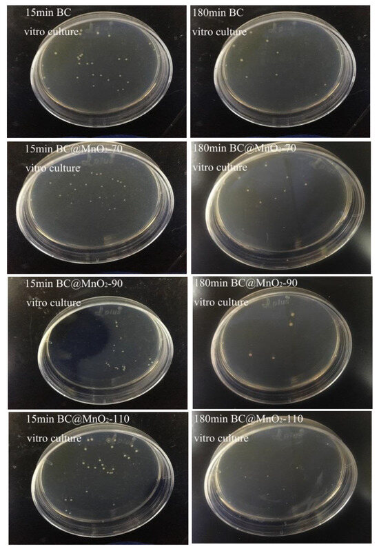 Figure 7 shows the comparison of the number of colony-forming units after 15 min and 180 min of the in vitro culture with BC and BC@MnO2-70, -90, and -110 materials. It was observed that there was a significant change in the number of colonies after both 15 min and 180 min of the in vitro culture. Specifically, the BC@MnO2-90 material showed a more pronounced reduction in the number of colonies after 180 min of the culture, decreasing from 22 to 4. This indicated that the BC@MnO2-90 material had the best bacterial removal effect in the in vitro culture. It was suggested that during the in vitro bacterial culture, the uniform nanosheet structure of MnO2 loaded on the BC@MnO2-90 material not only enhanced the material’s adsorption properties but also increased its physical cutting effect, thereby improving the material’s bactericidal performance.