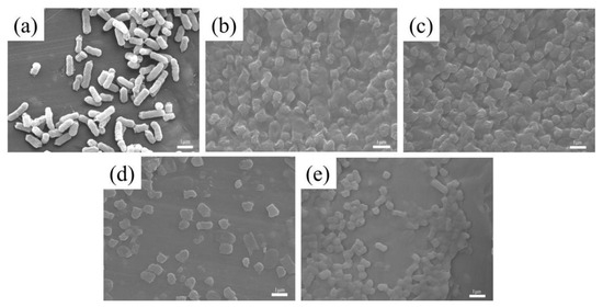 Figure 9 shows the FESEM images of E. coli after 60 min of the in vitro culture with BC and BC@MnO2-70, -90, and -110 materials. Figure 9a is the FESEM image of the control E. coli. From Figure 9b–e, it can be clearly seen that after 60 min of the in vitro culture with the bamboo carbon material, the morphology of the bacterial cells exhibited two phenomena: first, the cell surface changed from smooth to wrinkled, and second, there were obvious physical defects at both ends of the cells, with cell rupture and dissolution. Based on these observations, the mechanism of bacterial removal by bamboo carbon material during the in vitro culture is inferred. Under electrostatic action, bacterial cells were adsorbed onto the material surface, leading to a physical blocking effect. Additionally, it can be clearly seen from Figure 9b–e that after 60 min of the in vitro culture with the bamboo carbon material loaded with MnO2, the morphology of E. coli changed significantly, which was basically similar to Figure 9b–e, indicating that the bactericidal mechanisms were similar. However, the difference was that after 60 min of the in vitro culture with the bamboo carbon material loaded with MnO2, there were more bacteria showing signs of dissolution, and the dissolution phenomenon of BC@MnO2-90 was the most pronounced, indicating that the bactericidal effect of BC@MnO2-90 was superior to that of BC and BC@MnO2-70 and -110 materials. The sharp physical cutting effect caused by the manganese oxide nanosheet structure formed after loading MnO2 was greater than that of the bamboo carbon material.
