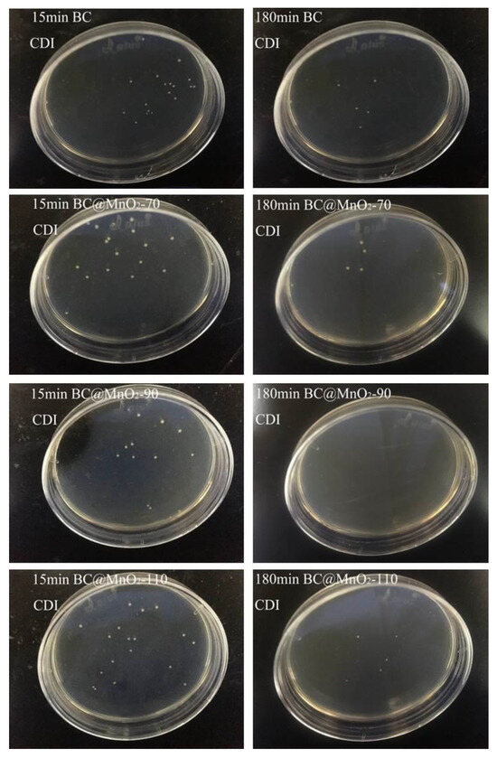 Figure 10 shows the comparison of colony-forming units after 15 min and 180 min of CDI bacterial removal with BC and BC@MnO2-70, -90, and -110 materials. It is evident from the figure that there was a significant change in the number of colonies after 15 min and 180 min of CDI bacterial removal with the bamboo carbon material. Specifically, the BC@MnO2-90 material has fewer colonies after 180 min of CDI bacterial removal compared to BC@MnO2-70 and -110, reducing from 11 to 0. This indicated that the CDI capacitive bacterial removal effect of the BC@MnO2-90 material was the best. During the CDI capacitive bacterial removal process, the external electric field enhanced the bactericidal effect of the electrode; after 180 min, the bacteria in the water body could be essentially killed by the BC@MnO2-90 material, fully reflecting the rapid effectiveness of CDI capacitive bacterial removal, which could quickly enrich bacteria and achieve the purpose of killing bacteria under the action of the manganese oxide composite electrode material within a short time. At the same time, it also indicated that loading MnO2 can effectively enhance the surface activity of the bamboo carbon material, thereby enhancing the sharp physical cutting effect of the bamboo carbon material on bacteria.