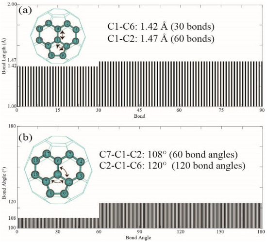 Profiles of bond lengths and bond angles of C60. (a) Bond lengths of C60; (b) Bond angles of C60.