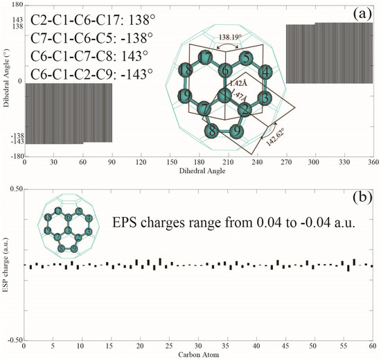 Dihedral angle and ESP partial charge of C60. (a) Dihedral angles of C60; (b) ESP charges of fullerene C60.