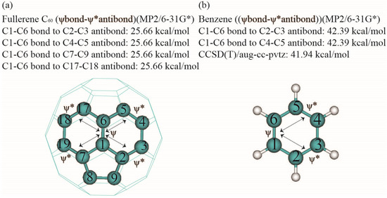 (a) Natural bond orbital delocalization of fullerene C60; (b) natural bond orbital delocalization of benzene. The star indicates antibond, the arrow indicates bond–antibond interaction.