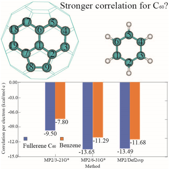 Single-point MP2 and Hartree–Fock (HF) energies were calculated using various basis sets based on the optimized geometries. The energy discrepancies between MP2 and Recovering electron correlation energy is a fundamental and challenging task in quantum chemistry. Correlation energy typically refers to the difference between the true total energy and the Hartree–Fock limit. It consists of two main components: static and dynamic correlation [80]. Static correlation arises from the fact that HF treats the many-body wavefunction as a single Slater determinant, whereas the exact total energy requires a combination of many determinants in the non-relativistic Schrödinger equation [81]. Dynamic correlation, or Pauli correlation, results from the mean-field approximation in HF, where instantaneous Coulomb repulsion is approximated by treating other electrons as an average charge distribution. HF already accounts for static exchange correlation between parallel spin electrons based on the anti-symmetry principle. MP2, through its perturbative potential, recovers electron correlation by considering electron-electron interactions [82]. The MP2-HF energy difference has been widely applied in evaluating correlation energy and the electron density matrix [83]. The MP2-HF discrepancy provides a major component of the electron correlation energy in C60, which has a delocalized π bond system [84]. As shown in Table 5 and Figure 6, the MP2-HF energy differentials for fullerene C60 are −9.50, 13.65, and −13.49 kcal/mol per electron for calculations at MP2/3–21G*, MP2/6–31G, and MP2/Def2SVP, respectively. The MP2/Def2SVP basis set yields the same correlation energy per electron as MP2/6–31G*, while MP2/6–31G* shows a notable improvement of 4.15 kcal/mol per electron compared to MP2/3–21G*. A similar pattern is observed in the MP2-HF energy discrepancies for benzene across different basis sets. Notably, our calculations consistently show that fullerene C60 provides 2.30, 2.36, and 1.81 kcal/mol more correlation energy per electron than benzene at MP2/3–21G*, MP2/6–31G*, and MP2/Def2SVP, respectively. It is also worth mentioning that the CCSD(T)/aug-cc-pVTZ method produces significantly larger correlation energy (15.54 kcal/mol per electron) than all other results computed at the MP2 level, which motivates future CCSD(T) calculations on fullerene C60 derivatives. The importance of correlation energy is well-established in small delocalized π systems [85]. Aromaticity, a fundamental concept in organic chemistry [86], refers to the stabilization of conjugated cycloalkenes due to delocalized π-electrons following the 4n + 2 rule and exhibiting no diamagnetic properties in a magnetic field. The precise definition of aromaticity is still debated, but it has been evaluated from structural [87], energetic [88], reactivity [89], and magnetic perspective [90]. Fullerene C60 has been considered antiaromatic rather than aromatic due to its high positive heat of formation (610 kcal/mol) [12]. However, its aromaticity has also been evidenced both experimentally [18] and theoretically [16]. Magnetic shielding effects of frontier orbitals have been demonstrated in endohedral complexes of small molecules (e.g., helium or formaldehyde) encapsulated within fullerene C60 [19,60,61]. Therefore, other electronic factors influencing electron correlation in fullerene, such as strain destabilization energy, will be explored in future work [45].