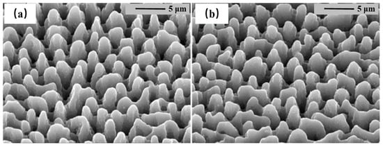 Scanning electron microscope (SEM) images of the (a) Si:N and (b) Si:N/Se at a laser fluence of 2.9 kJ/m2. The photos are viewed at 45° to the normal.