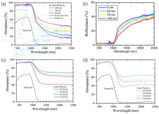 (a) Absorptance spectra of planar Si reference and Si:N/Se samples with different Se precursor thickness, with different laser fluence; (b) reflectance spectra of the Si:N/Se samples with different Se precursor thickness; absorptance spectra of planar Si reference and Si:N/Se samples with different Se precursor thickness (c) before and (d) after rapid thermal annealing at 800 K for 5 min.