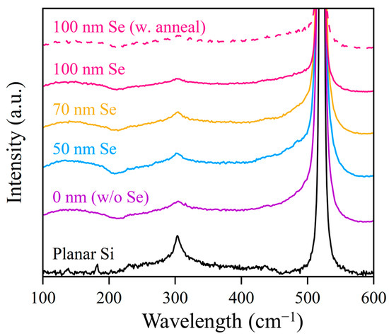 Raman spectra of unannealed planar Si reference and Si:N/Se samples with different Se precursor thicknesses. A Si:N/Se sample with a 100 nm Se film precursor annealed at 875 K for 5 min and Si were given as compared. All hyperdoped Si samples were fabricated with a 4.0 kJ/m2 laser fluence.