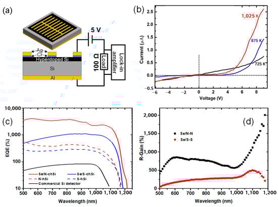 The I-V characteristics of these photodetectors were measured using a semiconductor parameter analyzer (4200-SCS/F); as seen in Figure 4b, higher RAT temperature (up to 1025 K) induces better rectification properties as inferred from higher current at positive bias. Previous studies have identified 975 K (700 °C) as the optimal annealing temperature for improving the optical absorption, rectifying behavior, and photoresponsivity for Si:Se samples. In this work, more devices were fabricated based on hyperdoped Si annealed at 1025 K to study the photoelectric characteristics. In addition to devices based on hSi fabricated with an NF3 atmosphere, samples with SF6 atmosphere were also analyzed, i.e., Si:S and Si:S/Se, for comparison. A photoelectric measurement system composed of a bromine tungsten lamp (LSH-T150, 150 W), a grating monochromator (Omni-λ 300, cover 400–2500 nm with 0.1 nm spectral resolution), and a lock-in amplifier (Stanford SR830) was used to measure the photoelectric response characteristics at room temperature in a dark environment. During the measurement, the lock-in amplifier parallel with a load resistance (100 Ω) and a 5 V bias was added on all these photodetectors including the commercial Si planar, as exhibited in Figure 4a.