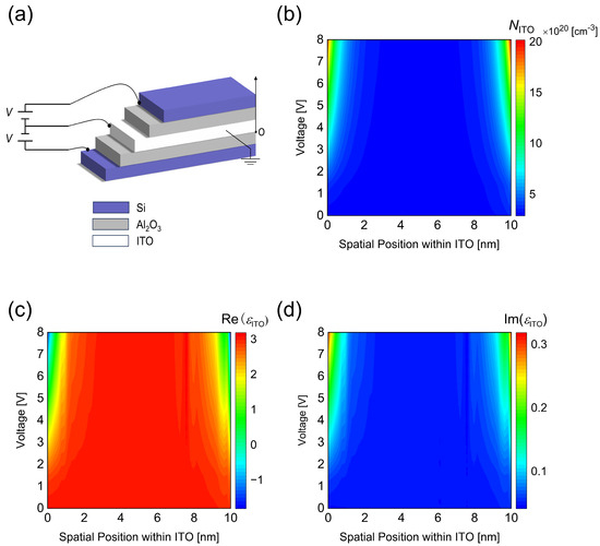 After solving the Poisson equation and the drift-diffusion equation, the spatial distribution of carrier concentration within the active region of ITO is transformed into a spatial distribution of dielectric constant using a dispersion model, which can be subsequently incorporated into optical simulations. The dielectric constant of ITO can be obtained from the Drude model [20]:
