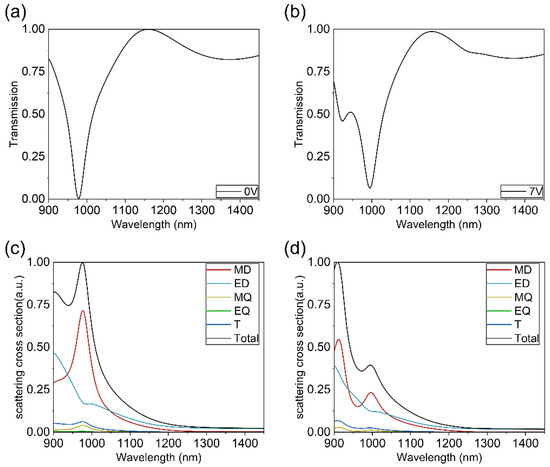 Transmission spectrum of the metasurface and corresponding scattering cross-sections obtained at different voltages. In this part, we set the inner radius and outer radius of nanoring units to be 80 nm and 160 nm, respectively. (a) Transmission spectrum of the metasurface under TE-polarized incident light without an applied bias voltage and (b) with a 7 V applied bias voltage. (c) Calculated scattered cross-sections for electromagnetic multipoles of the metamaterial array without applied bias voltage and (d) with a 7 V applied bias voltage. The plot displays the first five multipoles: magnetic dipole (MD), electric dipole (ED), toroidal dipole (T), electric quadrupole (EQ), and magnetic quadrupole (MQ).