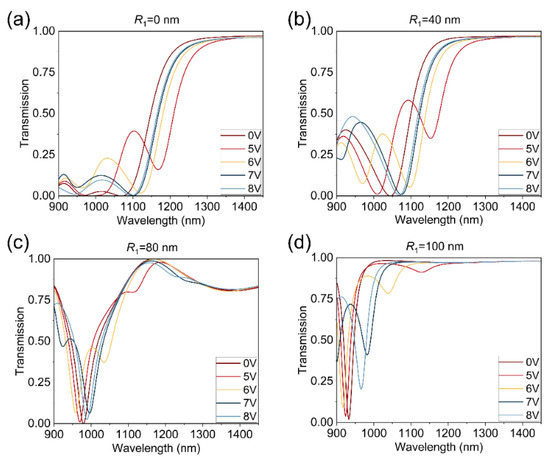 Transmission spectrum of the electrically tunable metasurface under different voltages, with inner radius R1 = 0 nm, 40 nm, 80 nm, and 100 nm, and outer radius R2 = 160 nm. The light source is a normally incident TE-polarized plane wave.